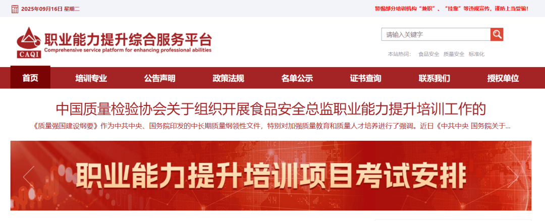 第一步:正在旅逛器输入进入 中国质量查验协会官网,或者百度搜刮“中国质量检 验协会”进入官网。第二步:官网页面下滑点击“职业 能力提拔培训栏目” 。
