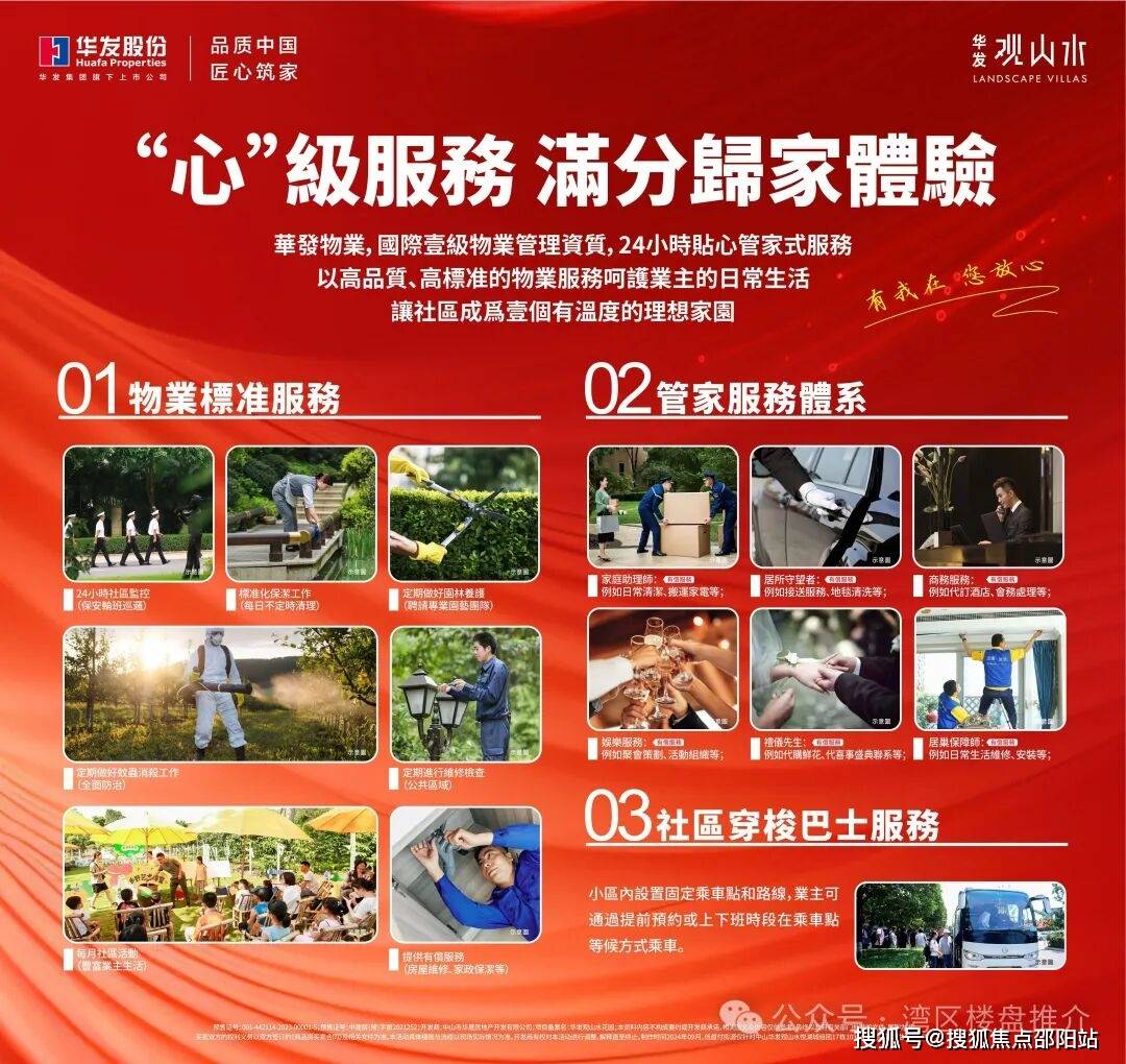華發物業,擁有國家一級物業办理資質,24小時護衛家人平安。結合港人糊口習慣及對糊口的高品質要求,貼心供给標准服務、管家式服務、驚喜服務、適老增值服務等,並设置装备摆设業从專屬管家,處處彰顯禮遇,讓社區鄰裏交换更便利,讓友鄰更溫暖。