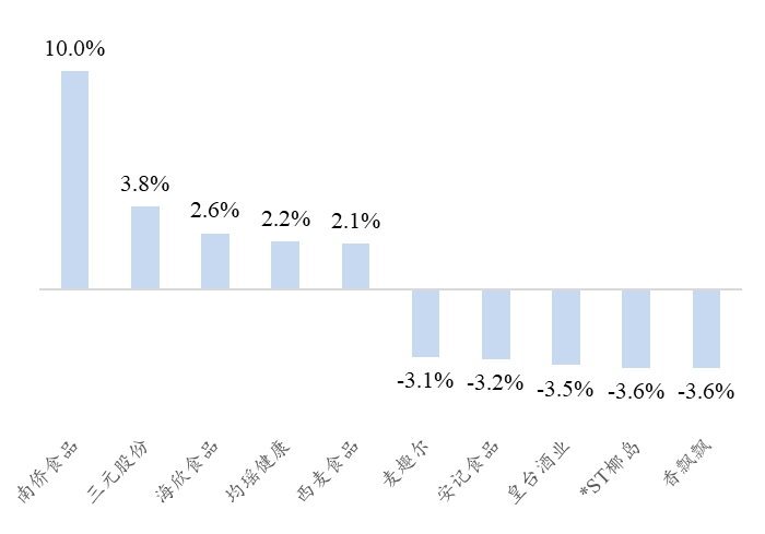 2、食物饮料板块中,软饮料(+0。6%)、烘焙食物(+0。6%)、肉成品(+0。5%)表示相对靠前。南侨食物、三元股份、海欣食物涨幅领先。